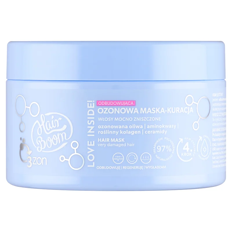 Hairboom O3zon Odbudowująca ozonowa maska-kuracja to kosmetyk stworzony dla włosów mocno zniszczonych, które potrzebują głębokiej regeneracji i wygładzenia. Dzięki synergii ozonowanej oliwy, aminokwasów, roślinnego kolagenu i ceramidów włosy stają się mocniejsze, odbudowane i pełne zdrowego blasku.