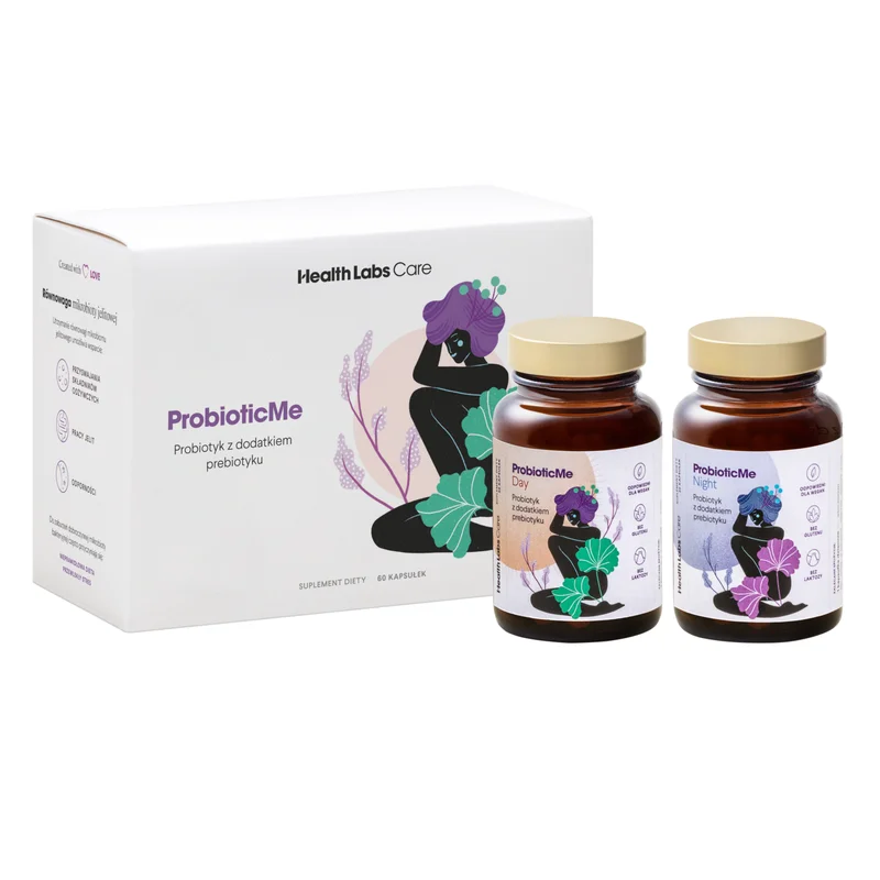 Health Labs Care, ProbioticMe Day+Night to suplement diety zawierający wyselekcjonowane bakterie i drożdże probiotyczne z prebiotykiem. Składniki wspierają równowagę mikroflory jelitowej. Produkt opracowany dla osób dorosłych.