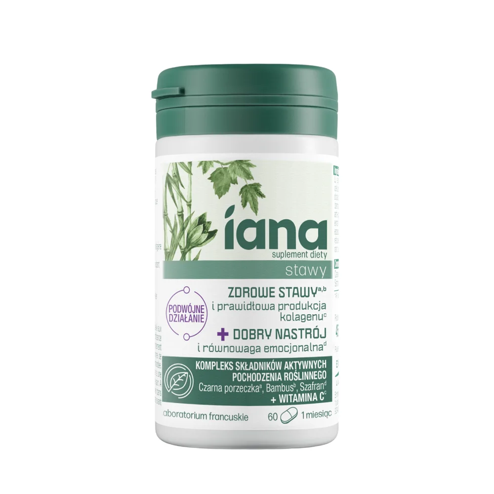 IANA Stawy Zdrowe stawy + Dobry Nastrój to suplement diety, który zawiera składniki wspierające prawidłowe funkcjonowanie stawów oraz przyczyniające się do dobrego samopoczucia. Suplement ten może być stosowany w celu uzupełnienia diety w substancje korzystne dla utrzymania komfortu ruchu.Składniki