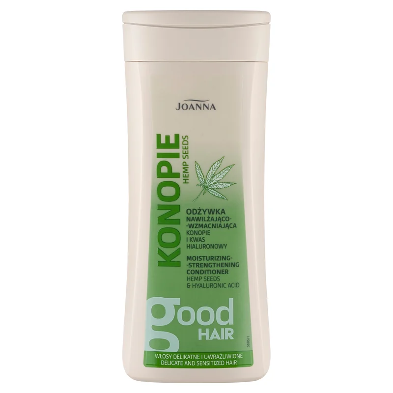Joanna Konopie, Odżywka nawilżająco-wzmacniająca to kosmetyk przeznaczony do włosów delikatnych i wrażliwych. Dzięki innowacyjnej formule wzbogaconej o aktywne składniki, odżywka głęboko nawilża, wzmacnia włosy, odżywia je od nasady po same końce oraz nadaje im zdrowy, promienny połysk. Produkt zapewnia włosom miękkość, lekkość i naturalną witalność przy codziennym stosowaniu.