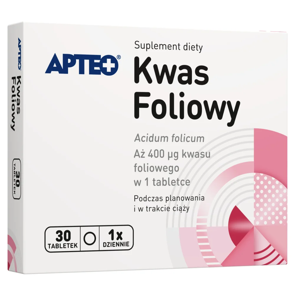 Suplement diety Kwas foliowy firmy Apteo występuje w postaci tabletek przeznaczonych do stosowania doustnego. Zawarty w preparacie kwas foliowy oddziałuje na wzrostu tkanek matczynych podczas ciąży. W efektywny sposób zabezpiecza przed występowaniem wad rozwojowych cewy nerwowej u rozwijającego się płodu. Bierze udział w procesie podziału komórek oraz tworzeniu się erytrocytów. Posiada także właściwości krwiotwórcze. Działa regulacyjnie na poziom homocysteiny (aminokwasu odpowiedzialnego za stan naszego zdrowia). Co więcej, działa wspomagająco na prawidłowy przebieg syntezy aminokwasów i produkcji krwi. Najprawdopodobniej obniża też ryzyko wystąpienia zmian nowotworowych.Zalecane dzienne spożycie