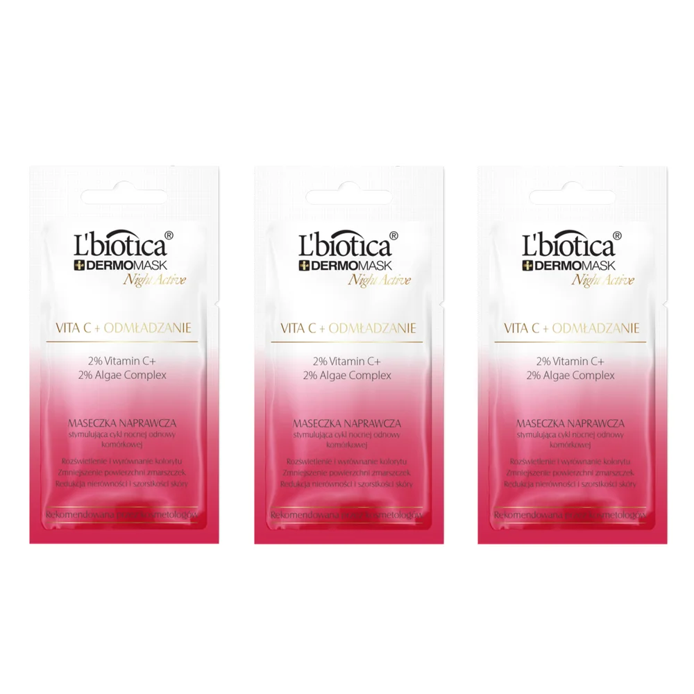 Lbiotica DermoMask Night Active Vita C to produkt kosmetyczny. Jest to maseczka naprawcza stymulująca cykl nocnej odnowy komórkowej. Formuła zawiera składniki aktywne, które mają na celu wspieranie procesów regeneracyjnych skóry podczas snu. Maseczka przeznaczona jest do pielęgnacji skóry, przywracając jej blask i poprawiając wygląd. Regularne stosowanie ma wpływać na odmłodzenie skóry oraz poprawę jej kondycji.Składniki/Ingredients