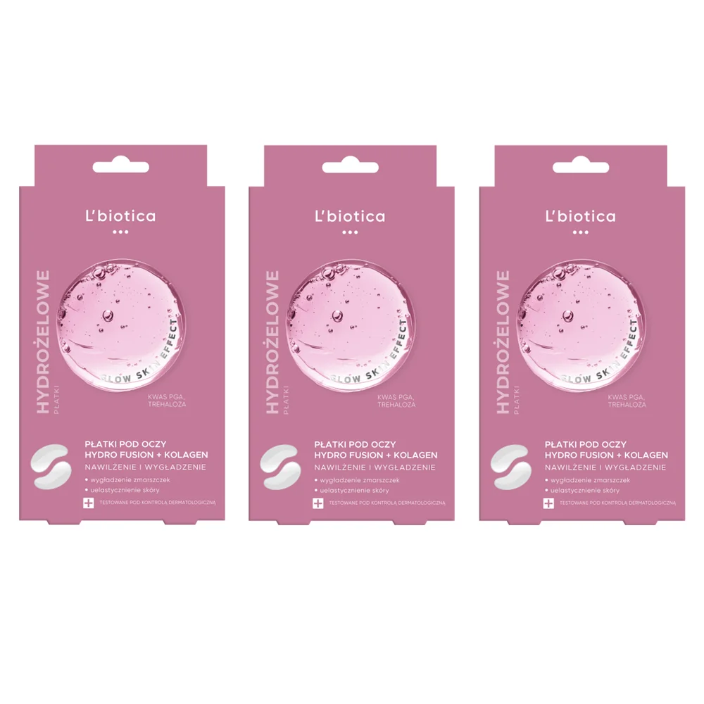 L'biotica Hydrożelowe Płatki pod oczy z kolagenem z aktywną hydroformułą zawierającą kwas poliglutaminowy SynerPGAHydroPower+®, kolagen, kompleks cukrowy oraz Microbiom Dermoprotect cplx natychmiastowo wygładzają skórę i redukują widoczność zmarszczek. Formuła Hydro Fusion:SynerPGAHydroPower+® – kwas poliglutaminowy, będący unikalnym polipeptydem o cenionych przez dermatologów właściwościach pielęgnacyjnych. Nawilża i wygładza - zatrzymuje w skórze do 5000 razy więcej wody niż sam waży, dając natychmiastowy, widoczny efekt hydrowypełnienia: długotrwałe nawilżenie, ujędrnienie i wygładzenie. Zwiększa ilość NMF (naturalnego czynnika nawilżającego) w skórze, odpowiedzialnego, za utrzymanie optymalnego wewnętrznego nawilżenia oraz ochronę przed transepidermalną utratą wody.Hamuje produkcję melaniny, zapewniając rozjaśnienie i wyrównanie kolorytu. Utrzymuje prawidłowe pH skóry.Właściwości produktu