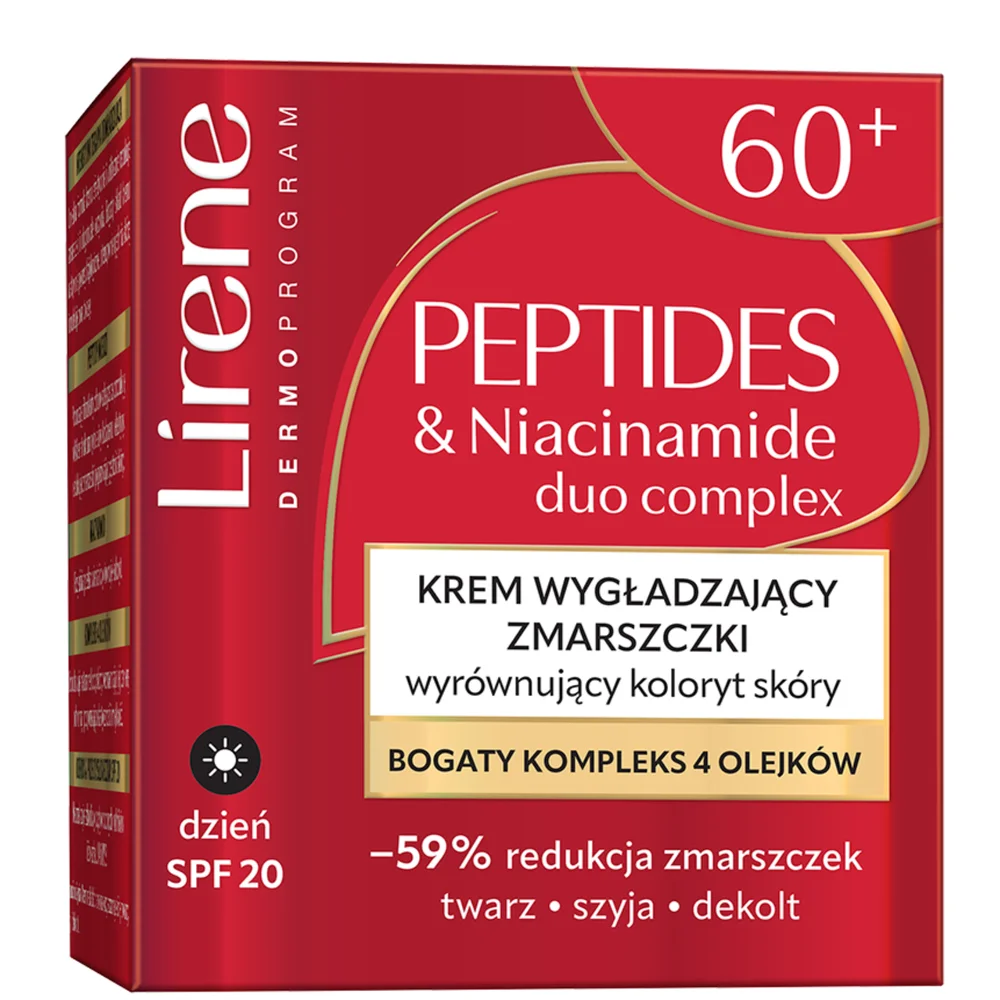 Lirene Krem wygładzający zmarszczki, wyrównujący koloryt skóry na dzień 60+ to produkt kosmetyczny, który został stworzony z myślą o dojrzałej skórze. Formuła kremu ma na celu wygładzenie zmarszczek oraz wyrównanie kolorytu skóry. Produkt wspiera nawilżenie oraz odnowę naskórka, przyczyniając się do poprawy ogólnego wyglądu cery. Krem jest przeznaczony do codziennego użytku w pielęgnacji dziennej.Składniki/Ingredients