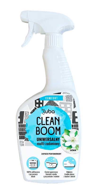 Luba Comfort Clean Boom, Uniwersalny, płyn do czyszczenia, Jaśmin to wszechstronny produkt, który radzi sobie z uporczywymi zabrudzeniami w całym domu. Pozostawia powierzchnie czyste, lśniące i pachnące delikatnym, kwiatowym aromatem jaśminu, a jego skuteczna formuła usuwa tłuszcz, osady i smary, przywracając blask i świeżość.
