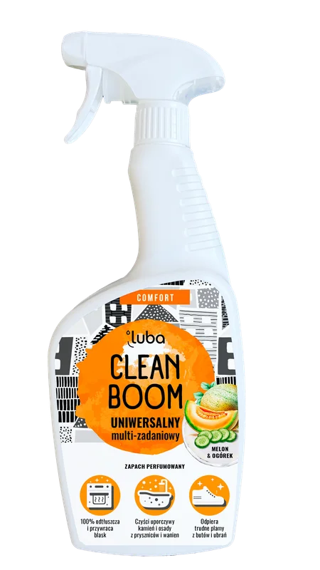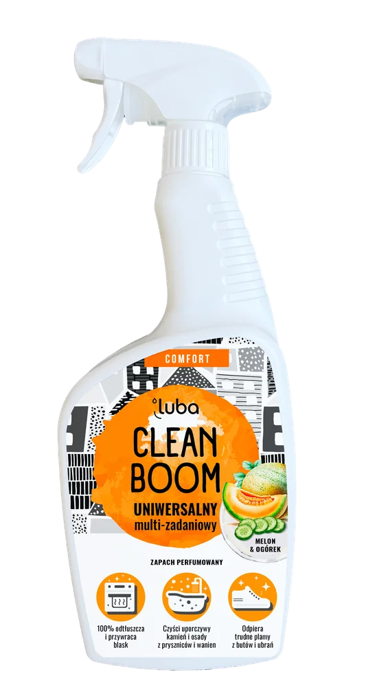 Luba Comfort Clean Boom to uniwersalny płyn do czyszczenia, dostępny w wariancie zapachowym melon i ogórek. Produkt przeznaczony do skutecznego czyszczenia różnych powierzchni w gospodarstwie domowym. Dzięki swojej formule, ułatwia usuwanie zanieczyszczeń. Płyn charakteryzuje się przyjemnym zapachem, który pozostaje na czyszczonych powierzchniach. Zaleca się stosowanie zgodnie z instrukcją na opakowaniu, aby uzyskać najlepsze rezultaty w czyszczeniu.Składniki/Ingredients