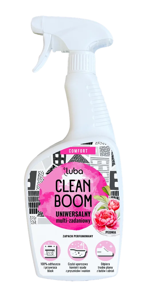 Luba Comfort Clean Boom to uniwersalny płyn do czyszczenia o zapachu peonii. Przeznaczony do różnych powierzchni w domu, ułatwia usuwanie zanieczyszczeń. Produkt charakteryzuje się odpowiednią formułą, umożliwiającą skuteczne czyszczenie. Może być stosowany w kuchni oraz w pomieszczeniach sanitarnych. Użycie płynu pozwala na zachowanie czystości i świeżości w obrębie sprzątanych miejsc. Przed użyciem zaleca się zapoznanie się z instrukcją obsługi.Składniki/Ingredients