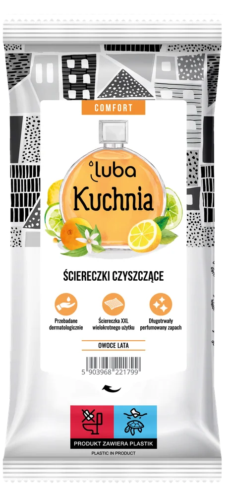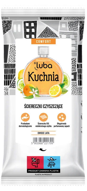 Luba Comfort, Czyszczące Ściereczki do kuchni, perfumowane to uniwersalne, czyszczące i nawilżane ściereczki, które sprawdzają się na różnych powierzchniach w domu. Skutecznie oczyszczają i pozostawiają przyjemny, długotrwały zapach.