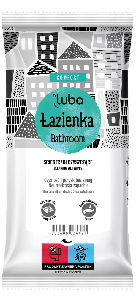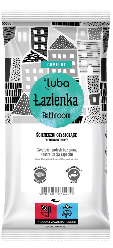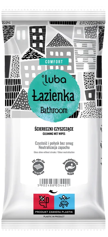 Luba Comfort, Nawilżane Ściereczki do łazienki to praktyczny, wielozadaniowy produkt, który ułatwia szybkie i wygodne utrzymanie łazienki w czystości. Ściereczki skutecznie usuwają brud, osady i kamień, pozostawiając powierzchnie pachnące, odświeżone i lśniące.