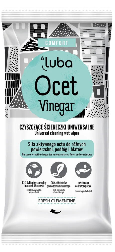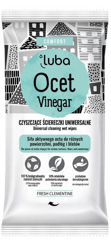Luba Comfort, Ocet, Uniwersalne Ściereczki do różnych powierzchni to praktyczne rozwiązanie do szybkiego i wygodnego utrzymania czystości w całym domu. Usuwają tłuszcz, odciski palców, resztki jedzenia i brud, sprawdzają się na podłogach, blatach i innych powierzchniach. Pozostawiają powierzchnie czyste, lśniące i przyjemnie pachnące, ułatwiając codzienne sprzątanie.