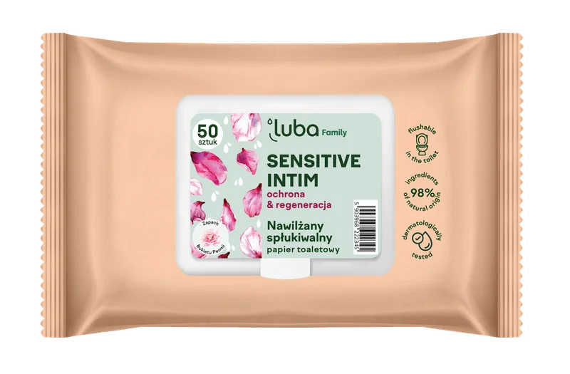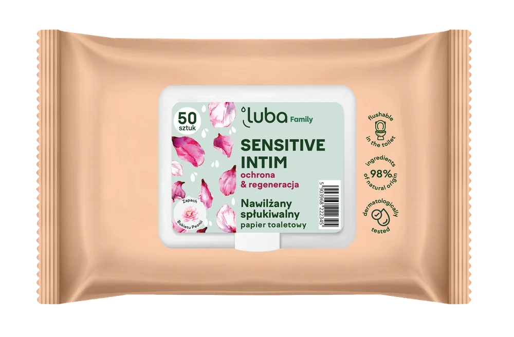 Luba Family Sensitive Intim, Papier toaletowy nawilżany spłukiwalny to produkt kosmetyczny, który łączy funkcjonalność codziennego produktu higienicznego z delikatnością chusteczek do pielęgnacji miejsc intymnych. Stworzony z myślą o szczególnie wrażliwej skórze, oferuje komfort, bezpieczeństwo i poczucie świeżości w każdej sytuacji – zarówno w domu, jak i poza nim.Składniki/Ingredients