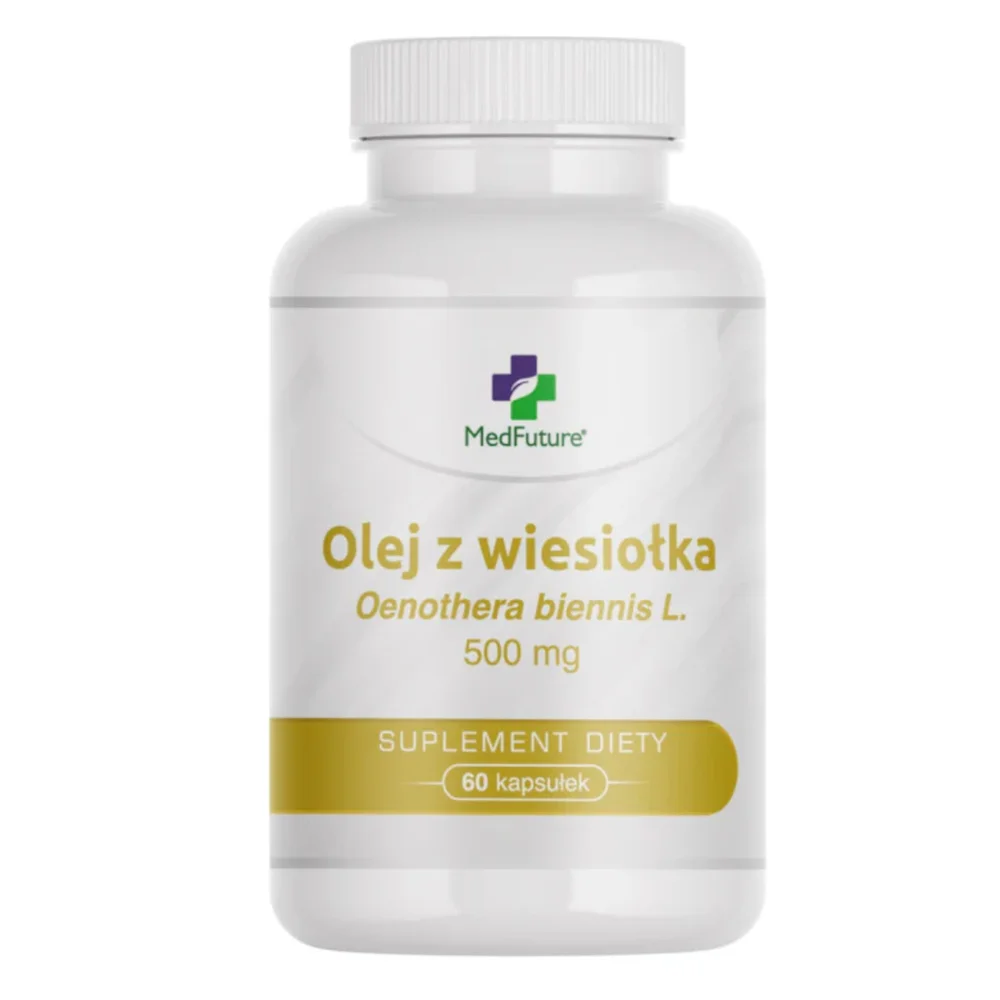 MedFuture Olej z wiesiołka 500 mg to suplement diety w formie kapsułek, zawierający olej z nasion wiesiołka oraz witaminę E. Produkt opracowany dla osób dorosłych.