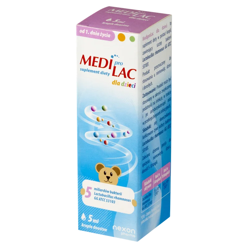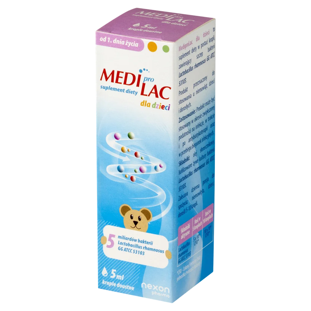 Mediprolac dla dzieci to suplement diety w płynnej formie przeznaczony dla niemowląt od 1. dnia życia, dzieci oraz dorosłych, zawierający szczep probiotyczny Lactobacillus rhamnosus GG (ATCC 53103), który wspiera utrzymanie prawidłowej mikroflory jelitowej. Preparat dostarcza do 10 miliardów bakterii w dziennej porcji (10 kropli) i może być stosowany szczególnie w okresach antybiotykoterapii oraz zaburzeń pracy jelit. Dzięki wygodnej formie kropli nie wymaga przechowywania w lodówce, co ułatwia jego codzienne stosowanie i podawanie zarówno najmłodszym, jak i dorosłym.