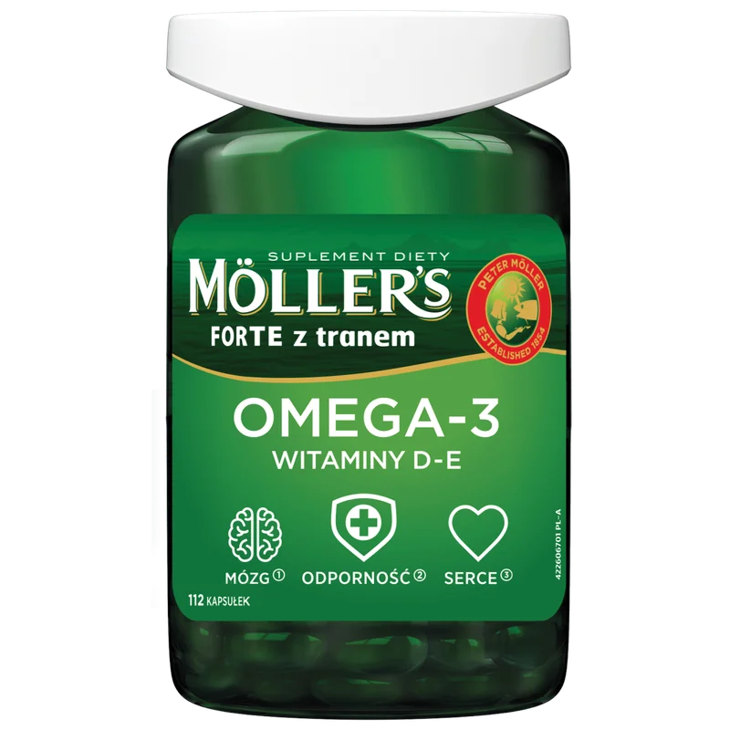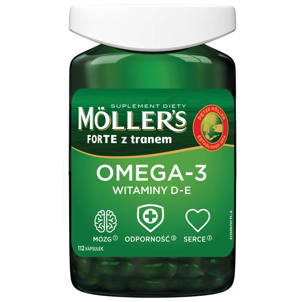 Moller's Forte z tranem to suplement diety zawierający olej z wątroby dorsza, naturalnie bogaty w kwasy omega-3. Składniki preparatu wspierają prawidłowe funkcjonowanie odporności oraz wspomagają pracę mózgu i serca. Produkt przeznaczony jest dla dorosłych oraz dzieci powyżej 6. roku życia.