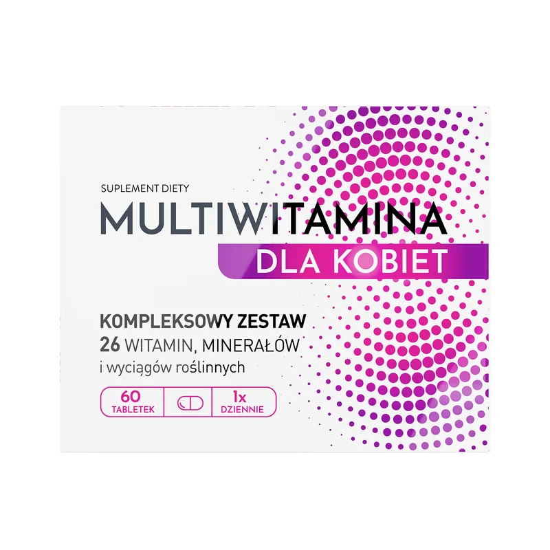 Multiwitamina dla kobiet to suplement diety w postaci tabletek, który w swoim składzie zawiera kompleks 26 witamin, minerałów i wyciągów roślinnych. Preparat przeznaczony jest dla dorosłych kobiet.