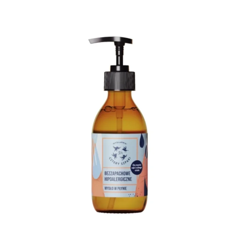 Bezzapachowe hipoalergiczne mydło w płynie od Mydlarni Cztery Szpaki to doskonały wybór dla osób o wrażliwej, skłonnej do podrażnień skórze. Stworzone z minimalnej liczby składników, mydło skutecznie oczyszcza, nie zaburzając naturalnej bariery hydrolipidowej.