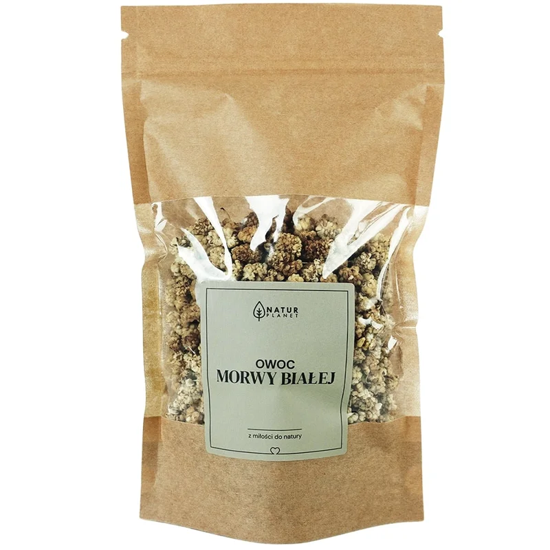 Natur Planet Morwa biała suszony owoc to środek spożywczy. Produkt charakteryzuje się naturalnymi składnikami, które mogą być wykorzystywane w różnych potrawach. Morwa biała ma słodki smak, co sprawia, że jest popularnym dodatkiem do musli, jogurtów oraz deserów. Może być także stosowana jako przekąska. Należy przechowywać w suchym i chłodnym miejscu, w szczelnie zamkniętym opakowaniu. Opisany produkt pochodzi od producenta, który stawia na jakość oferowanych artykułów.Składniki