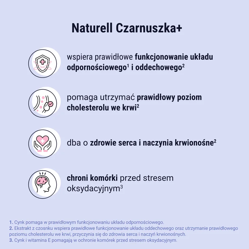 Naturell Czarnuszka+ to suplement diety, którego składniki wspierają prawidłowe funkcjonowanie układu odpornościowego oraz pomagają w utrzymaniu równowagi metaboliczne. Produkt dla osób dorosłych i dzieci od 6. roku życia.