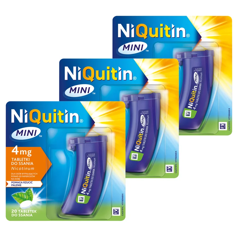 NiQuitin Mini 4 mg tabletki do ssania całkowicie rozpuszczają się w jamie ustnej, dzięki czemu cała dawka zawartej w nich nikotyny jest dostępna do wchłonięcia przez błonę śluzową policzków lub do połknięcia. Całkowite rozpuszczenie tabletki NiQuitin MINI i uwolnienie terapeutycznej dawki nikotyny następuje przeważnie w ciągu 10 minut.Wskazania