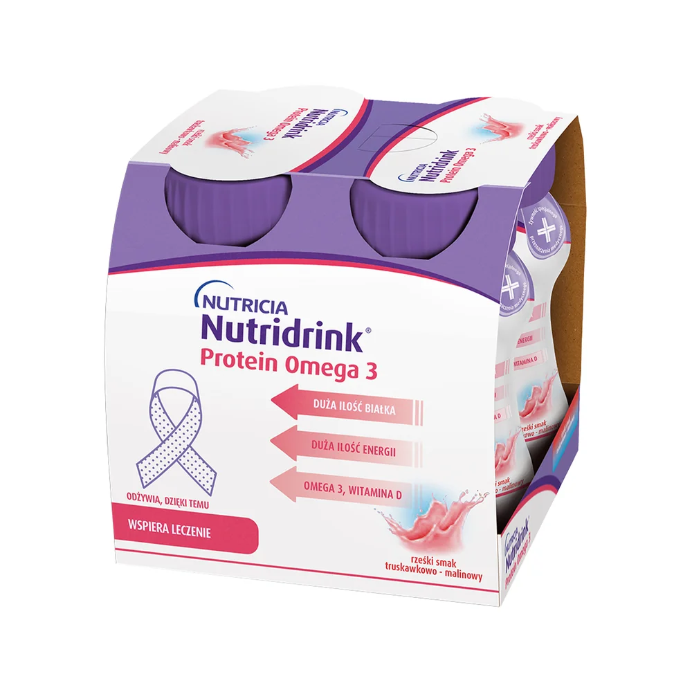 Nutridrink Protein Omega 3, rześki smak truskawkowo-malinowy to żywność specjalnego przeznaczenia medycznego do postępowania dietetycznego u pacjentów z chorobą nowotworową z niedożywieniem lub ryzykiem niedożywienia z nią związanym. Jest produktem wysokoenergetycznym, wysokobiałkowym, zawierającym kwasy tłuszczowe Omega 3, o wysokiej zawartości witaminy D.