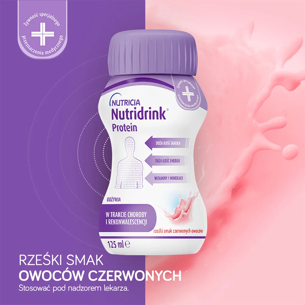 Nutridrink Protein, rześki smak czerwonych owoców to żywność specjalnego przeznaczenia medycznego dla osób niedożywionych lub zagrożonych niedożywieniem, szczególnie u pacjentów ze zwiększonym zapotrzebowaniem białkowym.