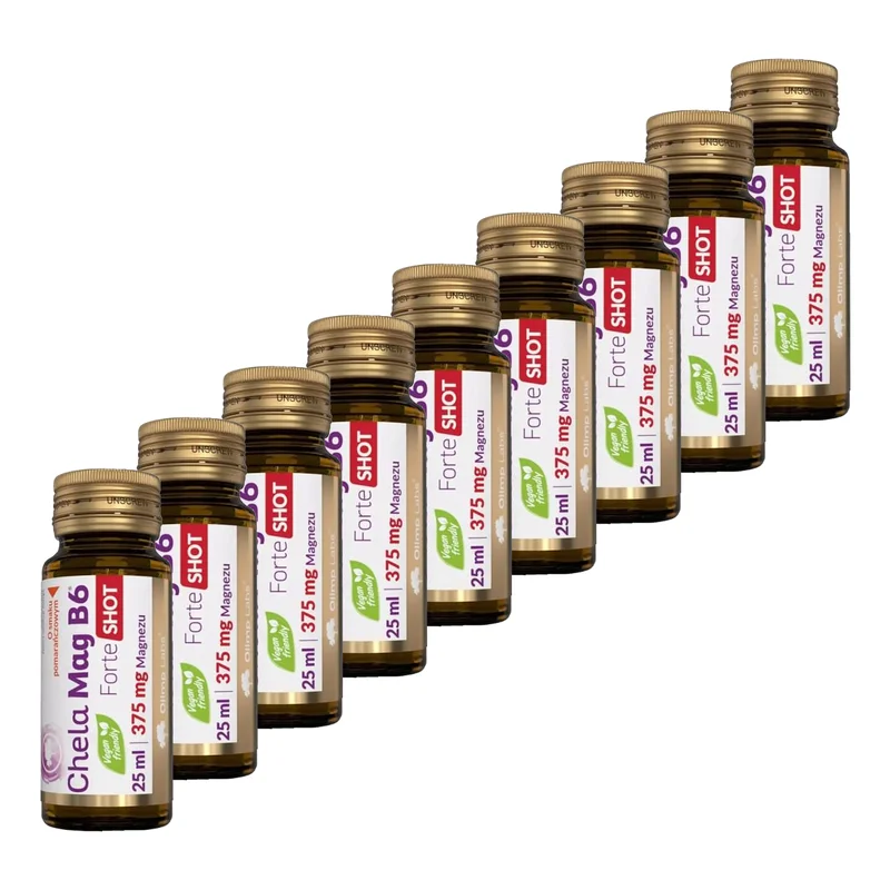 Olimp, Chela-Mag B6 Forte, Shot to suplement diety w postaci płynu o smaku pomarańczowym, który w swoim składzie zawiera wysoko przyswajalną formę magnezu oraz witaminę B6. Preparat przeznaczony jest dla osób dorosłych.