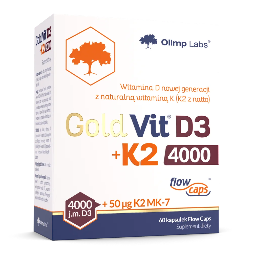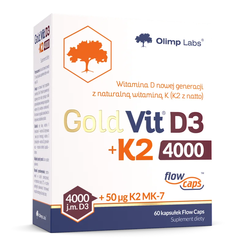 Olimp, Gold-Vit D3+K2 4000 IU to suplement diety, którego składniki wspierają prawidłowe wchłanianie wapnia oraz utrzymanie zdrowych kości i zębów. Produkt przeznaczony dla osób zdrowych powyżej 75. roku życia.