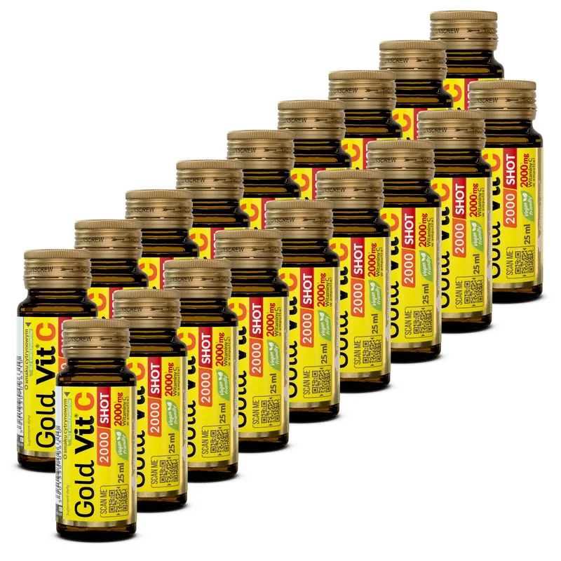 Olimp Labs Gold Vit C 2000 Shot to suplement diety, który zawiera witaminę C, wspierającą prawidłowe funkcjonowanie układu odpornościowego oraz uczestniczącą w procesach antyoksydacyjnych. Składniki suplementu pomagają w ochronie komórek przed stresem oksydacyjnym i wspierają produkcję kolagenu, co może być istotne dla właściwej kondycji skóry oraz funkcjonowania naczyń krwionośnych. Suplement przyczynia się do uzupełnienia diety w tę ważną witaminę.Składniki
