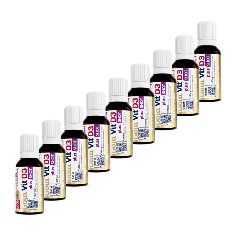 Gold Vit D3 plus SHOT to suplement diety w postaci płynu i proszku w ampułce z witaminami D i B6, magnezem oraz mikro kapsułkowanym szczepem bakterii probiotycznych Lactobacillus rhamnosus GG (ATCC 53103). Produkt dla osób dorosłych. Smak wiśniowy.Składniki