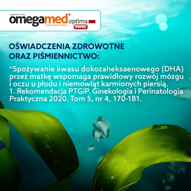 Omegamed Optima Forte DHA to suplement diety, który dostarcza DHA, kwas foliowy, jod oraz witaminę D. Produkt jest przeznaczony dla kobiet w II i III trymestrze ciąży oraz dla matek karmiących.