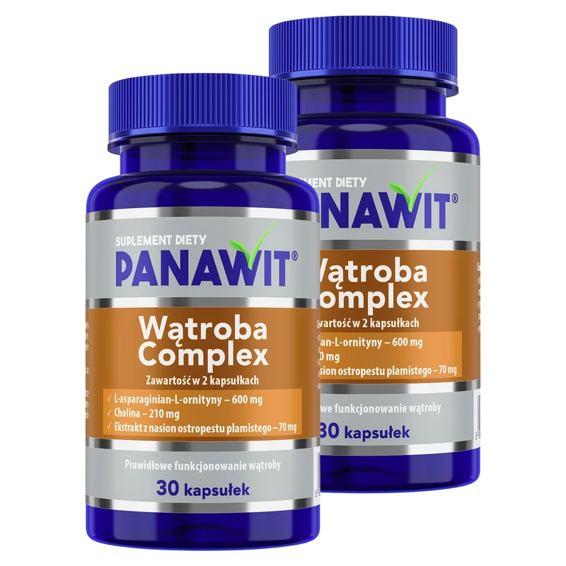 Panawit Wątroba Complex to suplement diety w formie kapsułek, zawierający L-asparaginian-L-ornityny, cholinę oraz ekstrakt z nasion ostropestu plamistego. Składniki produktu wspierają prawidłowe funkcjonowanie wątroby. Produkt dla osób dorosłych.Składniki
