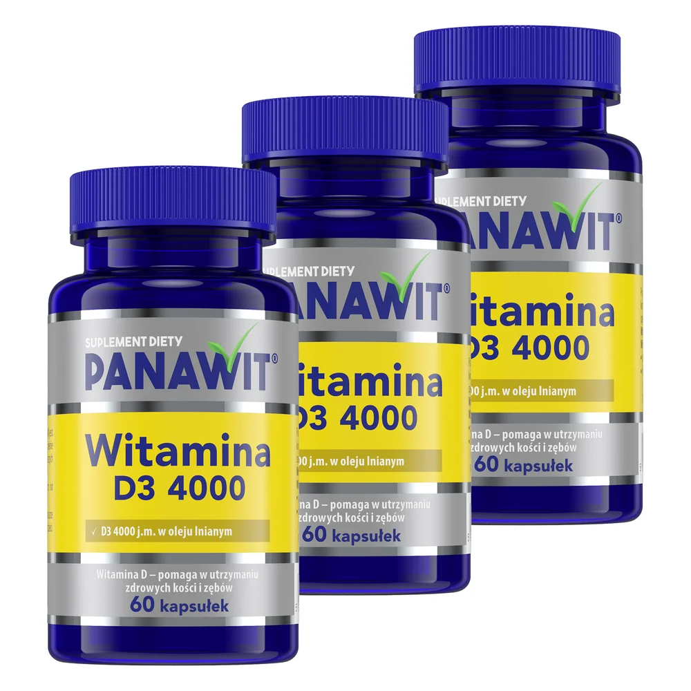 Panawit Witamina D3 4000 to suplement diety w formie kapsułek, którego składniki mają na celu uzupełnienie codziennej diety młodzieży, osób dorosłych i osób starszych z nadmierną masą ciała w witaminę D. Preparat zawiera witaminę D (cholekalcyferol) rozpuszczoną w oleju lnianym. W opakowaniu dostępnych jest 60 kapsułek, co jest wystarczające do przeprowadzenia dwumiesięcznej suplementacji przy zalecanym sposobie stosowania.