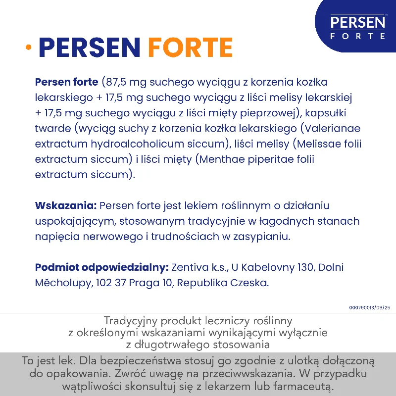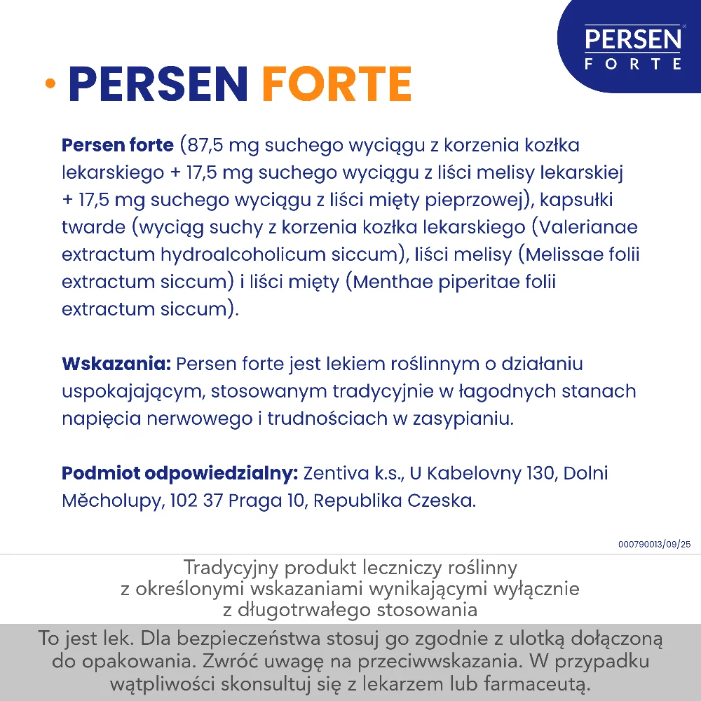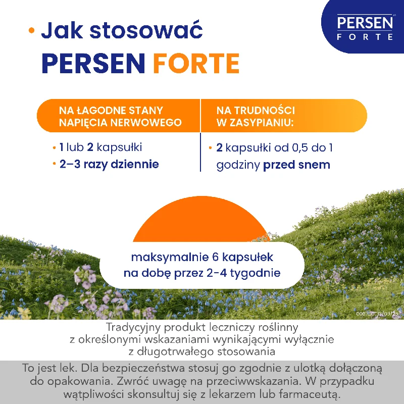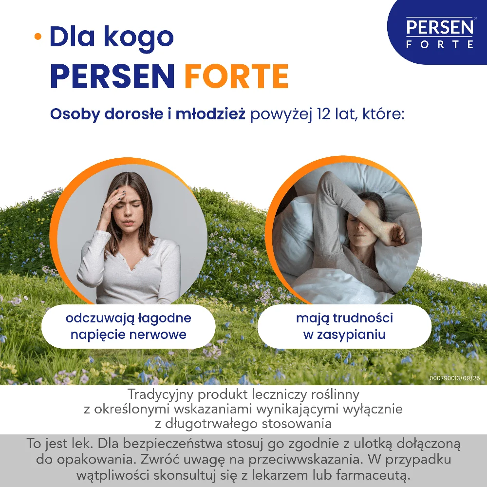 Persen forte jest lekiem roślinnym stosowanym w medycynie rodzinnej celem łagodzenia stanów napięcia emocjonalnego, niepokoju, trudności w zasypianiu oraz w leczeniu zaburzeń snu. Przeznaczony dla osób dorosłych.Kiedy nie stosować leku