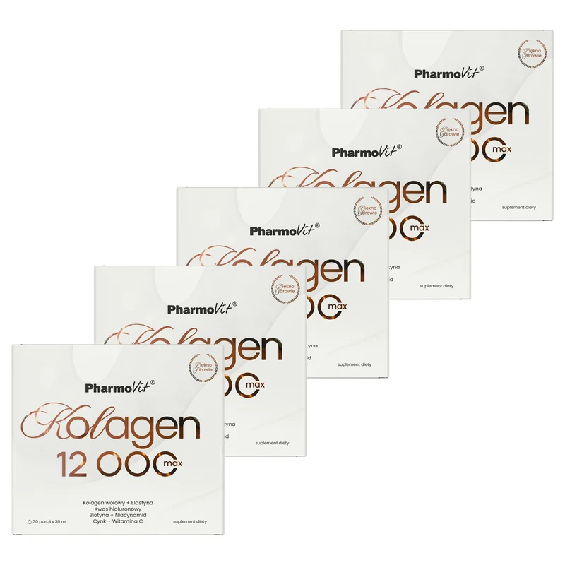 Pharmovit Kolagen 12 000 Max to suplement diety w formie płynnej, przeznaczony dla osób dorosłych, który dzięki wysokiej dawce hydrolizowanego kolagenu, kwasu hialuronowego, elastyny oraz witamin i minerałów wspiera naturalną produkcję kolagenu w organizmie, przyczynia się do utrzymania prawidłowej kondycji skóry, włosów i paznokci, a także wspomaga elastyczność stawów i ochronę komórek przed stresem oksydacyjnym.