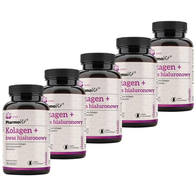 PharmoVit, Kolagen + kwas hialuronowy to suplement diety przeznaczony dla osób dorosłych, którego starannie dobrane składniki wspierają utrzymanie prawidłowej kondycji skóry, włosów i paznokci, a także pomagają zachować elastyczność i sprawność stawów. Zawarty w preparacie kolagen stanowi istotny element budulcowy tkanki łącznej, kwas hialuronowy wspomaga odpowiedni poziom nawilżenia, natomiast witamina C przyczynia się do prawidłowej produkcji kolagenu, wspierając tym samym funkcjonowanie skóry, kości i chrząstek. Regularne stosowanie suplementu może stanowić wartościowe uzupełnienie codziennej diety osób dbających o wygląd, komfort ruchu oraz ogólną kondycję organizmu.