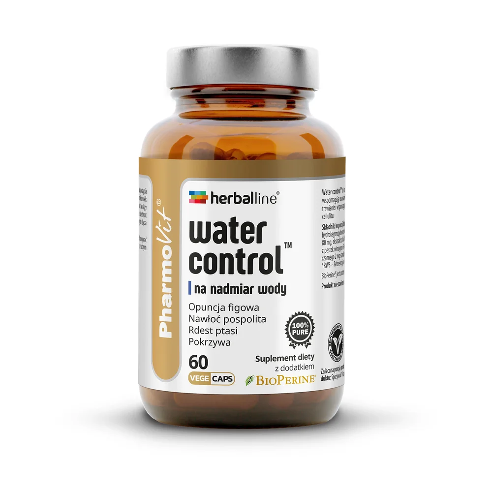 Pharmovit Water Control na nadmiar wody to suplement diety w formie kapsułek, zawierający ekstrakty: z opuncji figowej, nawłoci pospolitej, rdestu ptasiego oraz pokrzywy. Produkt dla osób dorosłych.