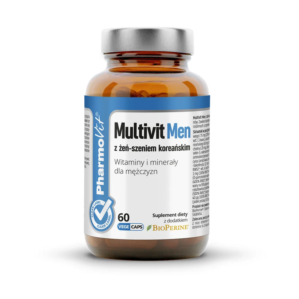 Pharmovit Multivit Men z żeń-szeniem koreańskim to suplement diety opracowany dla dorosłych mężczyzn. Produkt w swoim składzie zawiera witaminy i minerały oraz ekstrakty roślinne.