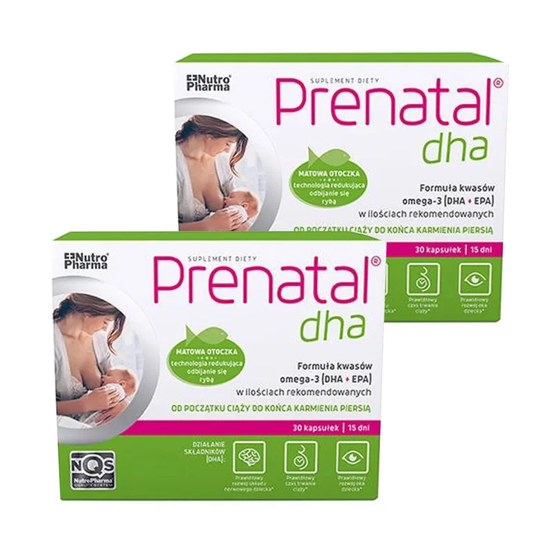 DHA (kwas dokozaheksaenowy) należy do niezbędnych wielonienasyconych kwasów tłuszczowych omega-3. DHA trzeba dostarczać z zewnątrz w gotowej formie, ponieważ organizm syntetyzuje go w ograniczonych ilościach. Stosowanie kwasu DHA w II i III trymestrze ciąży jest szczególnie istotne dla rozwoju mózgu oraz siatkówki oka dziecka. EPA (kwas eikozapentaenowy) ma bezpośredni wpływ na usprawnienie transportu DHA przez łożysko do płodu oraz jego stabilny poziom w błonach komórkowych. Dodatkowo bierze udział w przekazywaniu informacji między włóknami nerwowymi oraz normalizuje wydzielanie czynników prozapalnych. Witamina E pomaga w ochronie komórek przed stresem oksydacyjnym.Zalecane dzienne spożycie