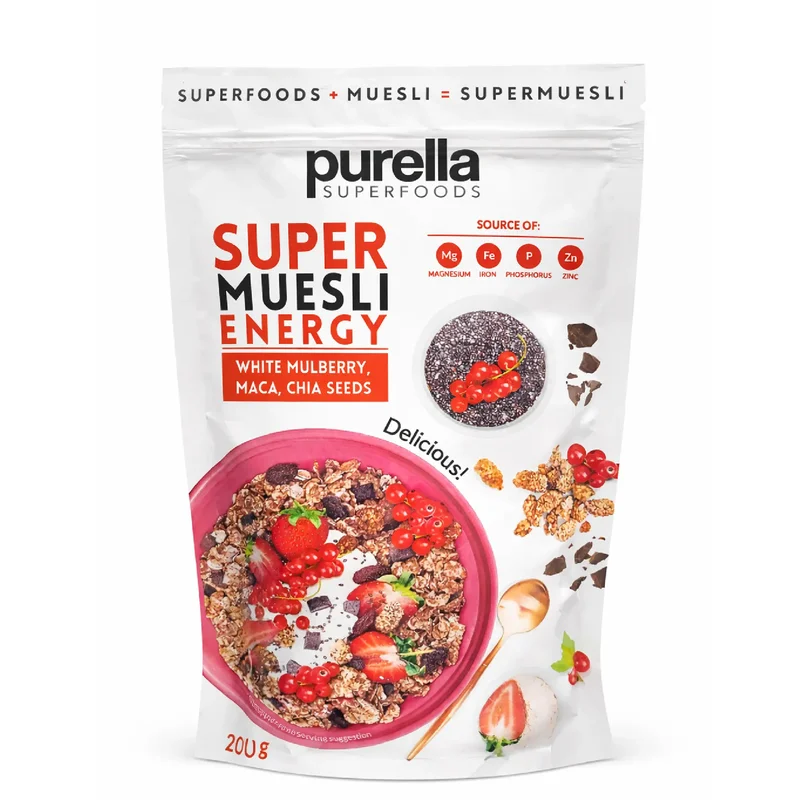 Purella Superfoods Super musli Energia to środek spożywczy składający się z mieszanki płatków zbożowych, orzechów, nasion oraz suszonych owoców. Produkt przeznaczony jest do spożycia jako dodatek do jogurtu, mleka lub jako samodzielna przekąska. Zawiera składniki źródła błonnika oraz węglowodanów. Oferuje różnorodność tekstur i smaków, co sprawia, że jest odpowiedni do różnorodnych posiłków. Może być częścią zrównoważonej diety.Składniki