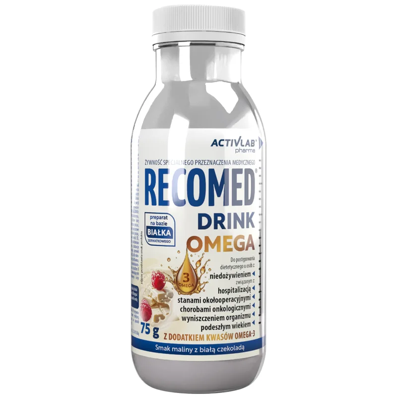 Recomed Drink Omega, malina - biała czekolada to środek spożywczy specjalnego przeznaczenia medycznego. Produkt ten występuje w formie napoju, łącząc smak malin i białej czekolady. Zawiera składniki, które są typowe dla tego typu produktów. Przeznaczony jest dla osób potrzebujących wsparcia w codziennej diecie. Produkt należy stosować zgodnie z zaleceniami podanymi na opakowaniu.Składniki