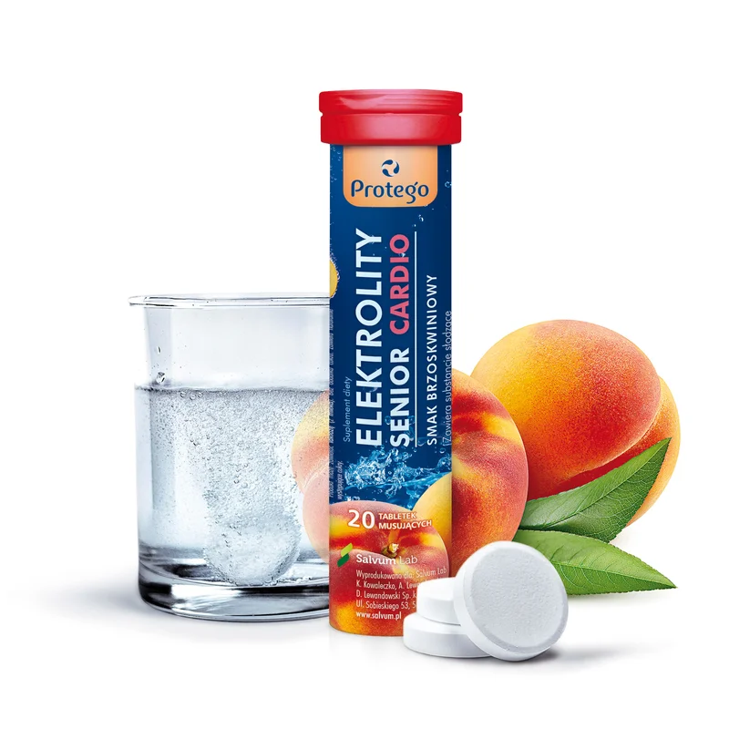Salvum Labs, Protego elektrolity Senior Cardio to suplement diety w formie tabletek musujących o smaku brzoskwiniowym. Produkt w swoim składzie zawiera elektrolity: potas, sód, magnez, chlorek czy wapń, a także witaminę C, B1 oraz ekstrakt z kwiatu głogu dwuszyjkowego. Suplement o obniżonej zawartości sodu, przeznaczony dla osób dorosłych.