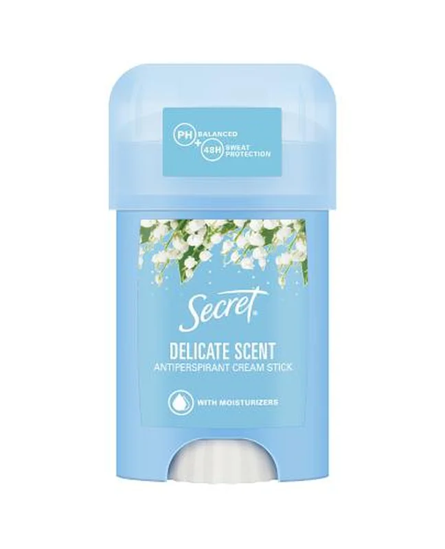 Kremowy antyperspirant w sztyfcie Secret Delicate Scent posiada kompozycję wzbogaconą o liczne substancje nawilżające, dzięki którym: gwarantuje zrównoważone pH, pozostawia skórę przyjemnie gładką i świeżą, zapewnia uczucie suchości,chroni przed powstawaniem nieprzyjemnego zapachu i mokrych plam, ponadto dzięki ulepszonej technologii przyjemna i świeża woń Delicate Scent utrzymuje się przez 48 godzin.Stosowanie produktu