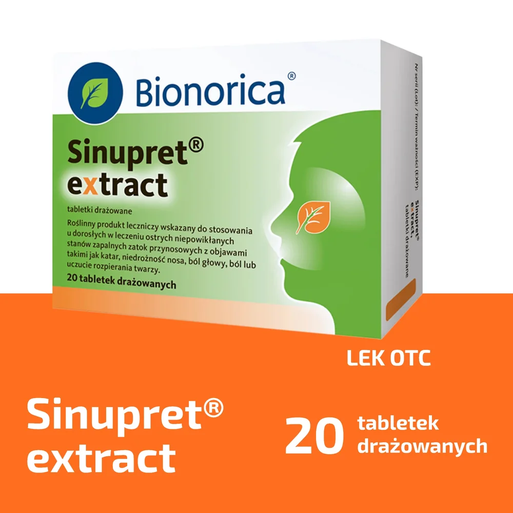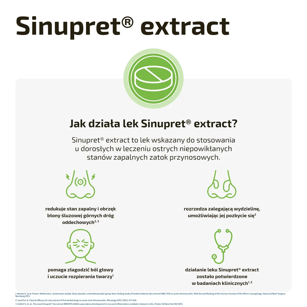 Sinupret extract jest wskazany do stosowania u dorosłych w leczeniu ostrych niepowikłanych stanów zapalnych zatok przynosowych (ostrego niepowikłanego zapalenia błony śluzowej nosa i zatok przynosowych).Kiedy nie stosować leku