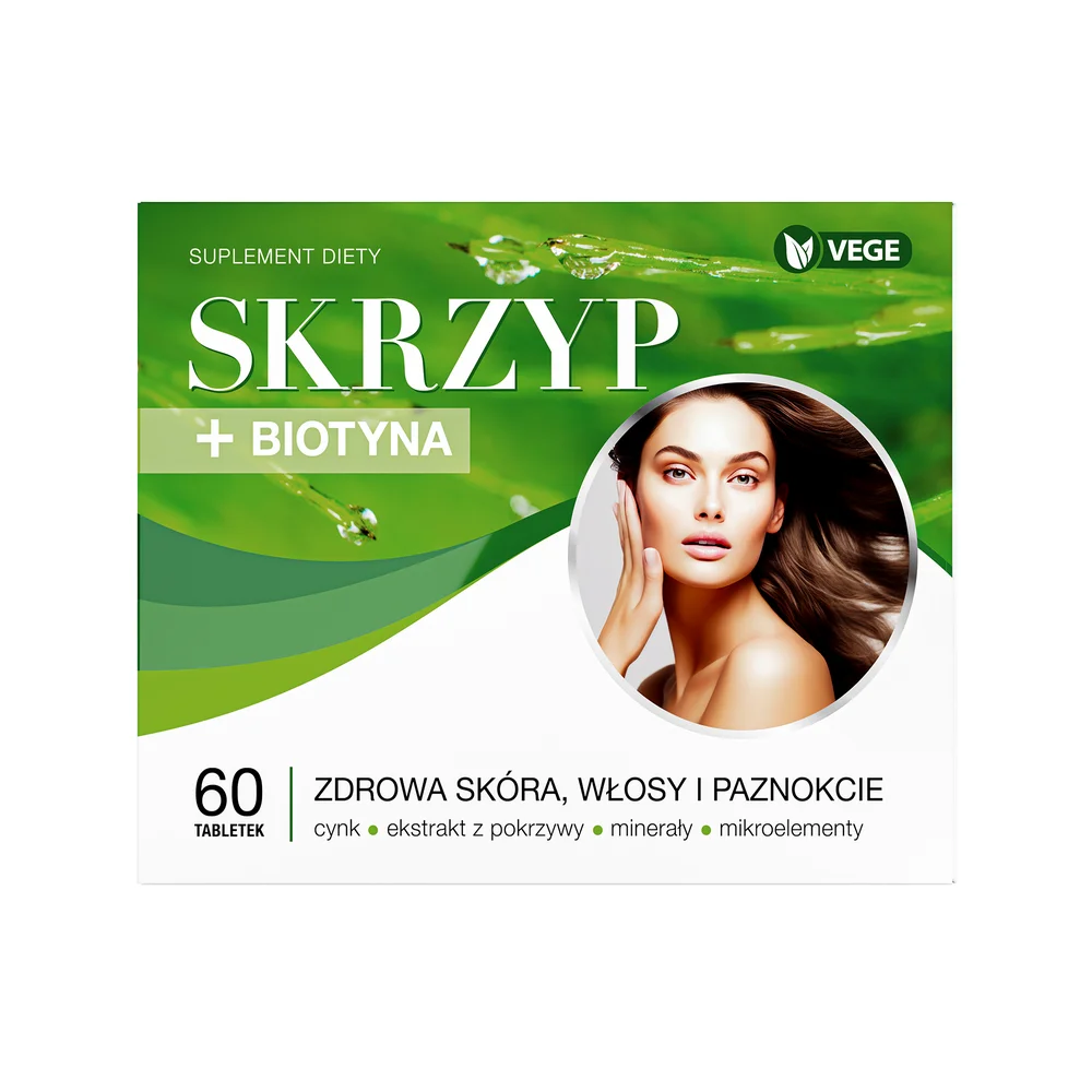 Skrzyp + Biotyna to suplement diety zawierający składniki wspierający zdrowie i wygląd włosów, skóry i paznokci. Produkt dla osób dorosłych.