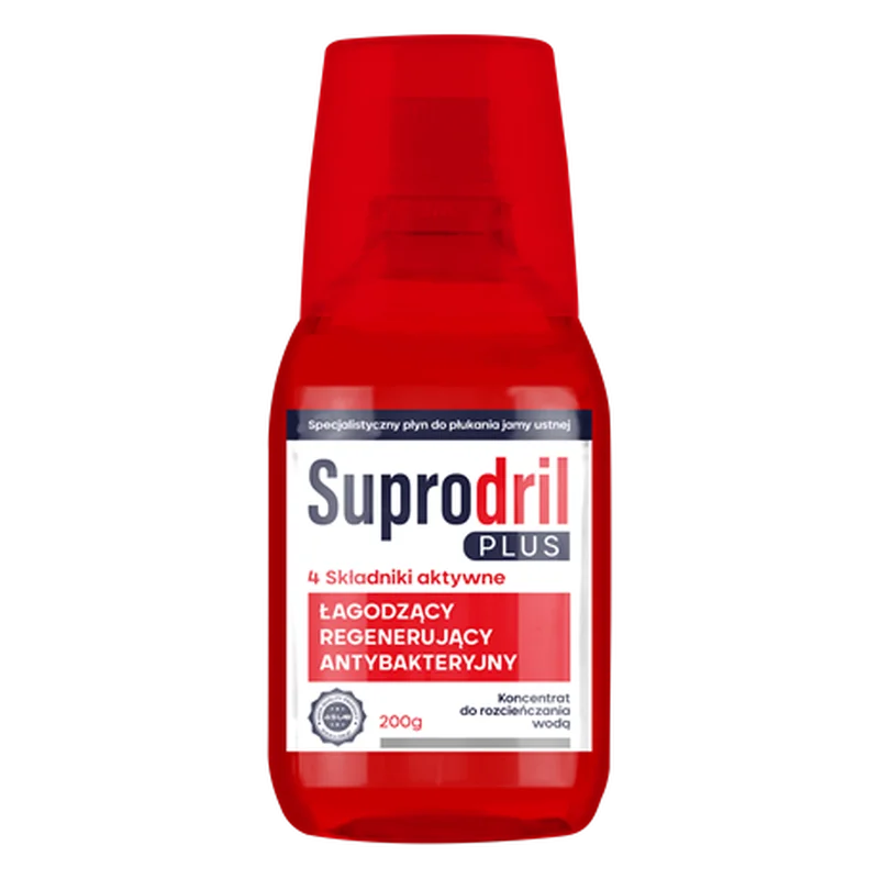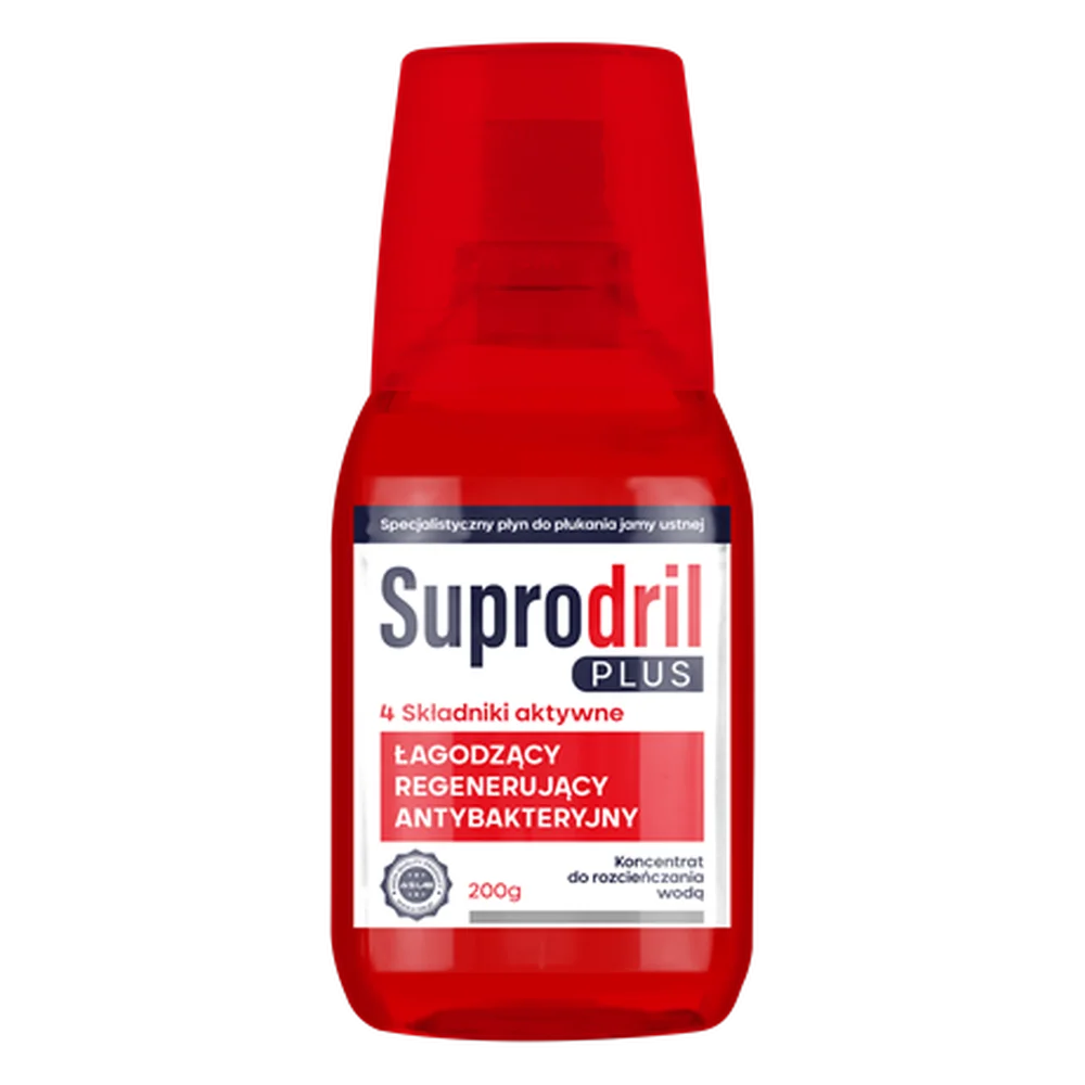 Suprodril Plus, specjalistyczny płyn do płukania jamy ustnej 200 g, przeznaczony jest do codziennej higieny jamy ustnej, wspomagając ochronę dziąseł, redukcję osadu i utrzymanie świeżego oddechu.