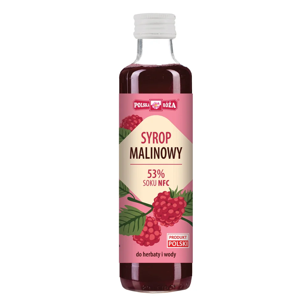 Polska Róża, Syrop malinowy to środek spożywczy przeznaczony do wzbogacania smaku napojów, idealny do herbaty, wody lub innych ulubionych napojów, zapewniając przyjemny malinowy aromat.