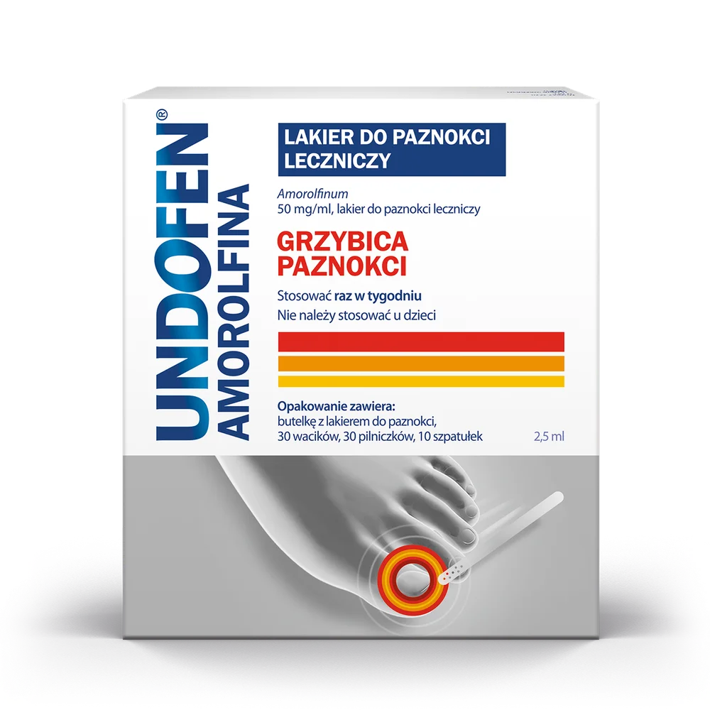 Undofen Amorolfina to lek przeciwgrzybiczy w postaci wskazany do stosowania miejscowego. Substancją czynną jest amorolfina, działająca na różnego rodzaju grzyby wywołujące grzybicę paznokci. Produkt aplikowany w postaci lakieru zapewnia odpowiednią penetrację leku, nawet do głębszych warstw paznokci. Dzięki dołączonym do produktu leczniczego akcesoriom, aplikacja leku jest łatwa i higieniczna.Wskazania