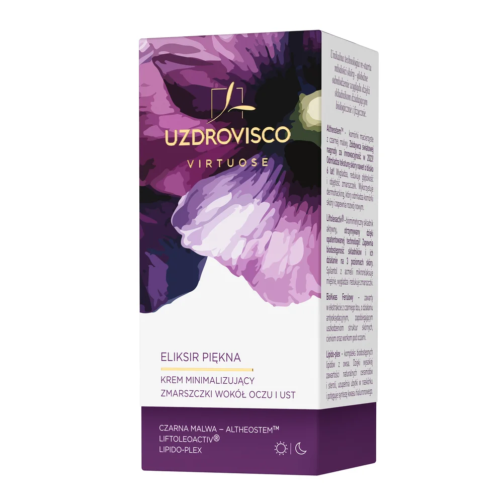 Uzdrovisco Virtuose Eliksir piękna, krem minimalizujący zmarszczki wokół oczu i ust to produkt kosmetyczny dla skóry dojrzałej, zmęczonej i wiotkiej. Multifunkcyjna formuła redukuje widoczność drobnych linii, wzmacnia delikatną skórę w okolicach oczu i ust oraz pozostawia ją miękką, komfortową i wypoczętą.