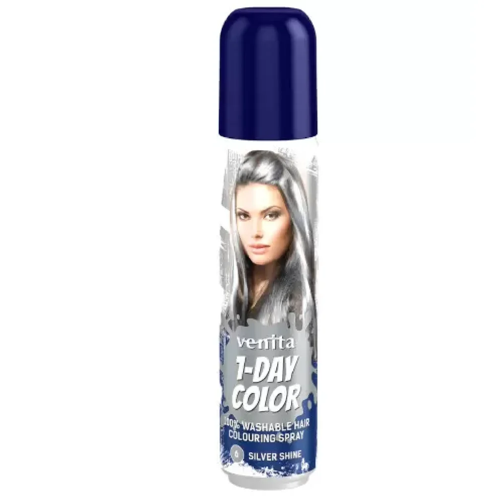 Venita 1-Day Color 6 srebrny blask to produkt kosmetyczny. Jest to kolorujący spray do włosów, który umożliwia szybkie i łatwe uzyskanie srebrzystego odcienia. Produkt przeznaczony jest do stosowania na suche włosy, a efekt koloryzacji jest tymczasowy, zmywalny podczas pierwszego mycia. Nie zawiera amoniaku, co minimalizuje ryzyko podrażnień skóry. Doskonale sprawdza się na specjalne okazje, oferując możliwość szybkiej zmiany wyglądu.Składniki/Ingredients