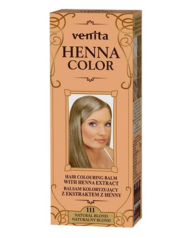 VENITA Henna Color Balsam Koloryzujący nr 111 Naturalny Blond to produkt kosmetyczny. Przeznaczony do koloryzacji włosów, nadaje im naturalny odcień blondu. W składzie zawiera składniki pielęgnacyjne, które odżywiają włosy podczas koloryzacji. Preparat łatwo się aplikuje, a efekt utrzymuje się przez dłuższy czas. Produkt nie zawiera amoniaku, co pozwala na łagodniejsze działanie na włosy. Idealny do odświeżenia koloru i nadania blasku.Składniki/Ingredients